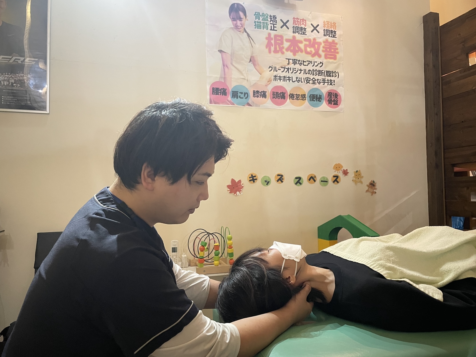 施術空間内にキッズスペースを準備し、ケガに対する施術とケガをしない身体、疲労回復や健康維持の為の施術を行います。痛みをとりたい!長い間困っている!このようお悩みの方は是非一度、ご来院ください。