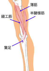 ☆「鵞足(がそく)」とは、膝から5cmほど下がったすねの内側にあり、脛骨(けいこつ:すねの骨)に縫工筋、薄筋、半腱様筋の3つがくっついている場所のことです。